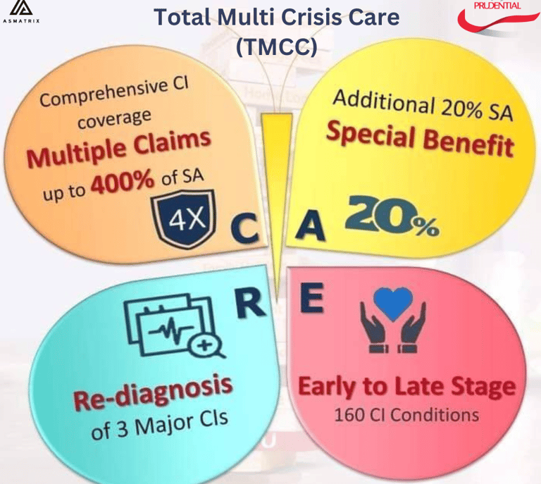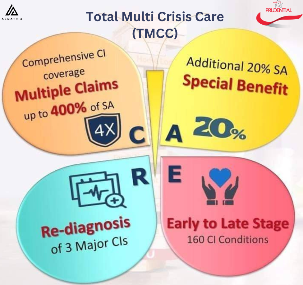 TMCC (Total Multiple Critical Care) is an insurance plan designed to address the risks of critical illnesses, providing multiple payouts and covering a variety of critical illnesses. Whether it is the first diagnosis or a recurrence, TMCC always protects the financial security of you and your family, helping you focus on recovery and face the future with peace of mind.