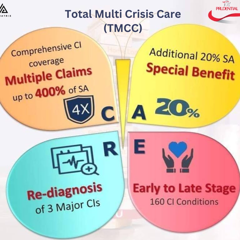 TMCC (Total Multi Crisis Care) is a multi-critical illness protection plan designed to meet modern health challenges. It covers more than 160 diseases, providing protection from early, mid-term to late-stage critical illnesses, helping you get the financial support you need at different stages.
