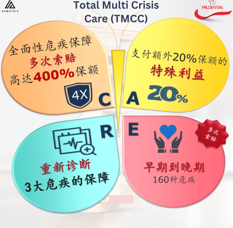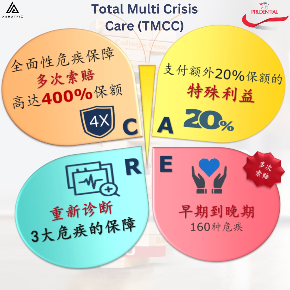 TMCC(Total Multiple Critical Care)是一款专为应对重症疾病风险而设计的保险计划,提供多次赔付保障,覆盖多种重症疾病。无论是初次诊断还是复发,TMCC始终为您和家人的财务安全保驾护航,帮助您专注康复,安心面对未来。